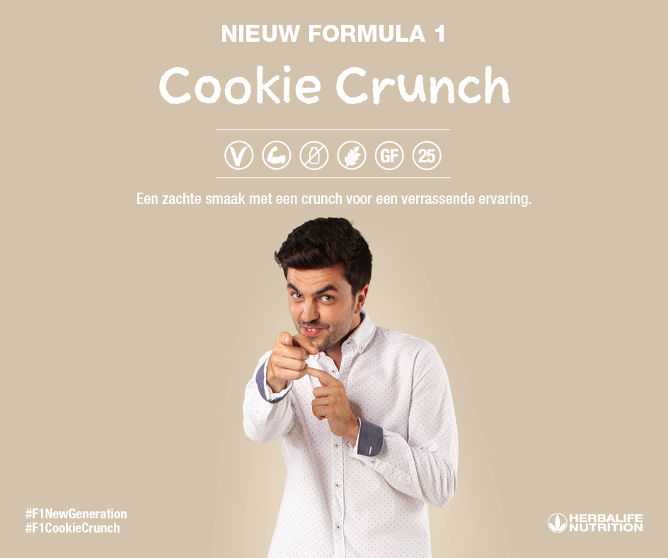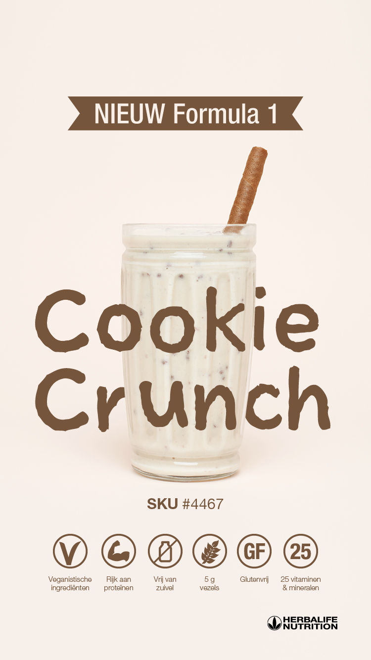 De Formula 1 Voedingsshake COOKIE CRUNCH Smaak bevat heerlijke knapperige cookie bolletjes.